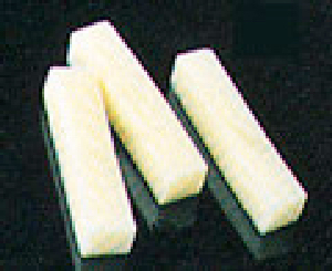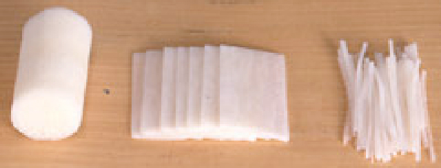 4〜5cm長さに切り、縦に1cm厚さに切り、横にして繊維にそって1cm幅の拍子木の形に切ります。