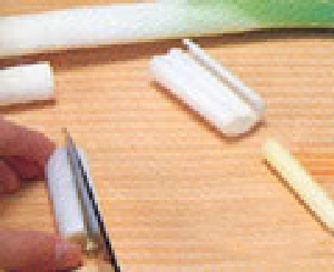 白ネギを4〜5cm長さの筒切りにし、縦に切り込みを入れ、中央の芯をとりだします。