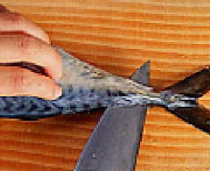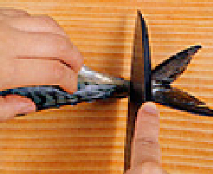 尾の方に逆包丁を入れ、付け根まで切ります。(皮の部分は尾についています。)