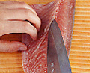 (8)の切り口に包丁をあて、骨を包丁に沿わせるようにして腹骨をすきます。