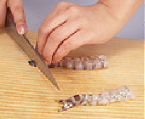 エビは加熱すると、背中を丸めた形に曲がるので、形よく仕上げるには、身の腹側に数ヶ所切り込みを入れた後、逆に背の方に軽く曲げましょう。